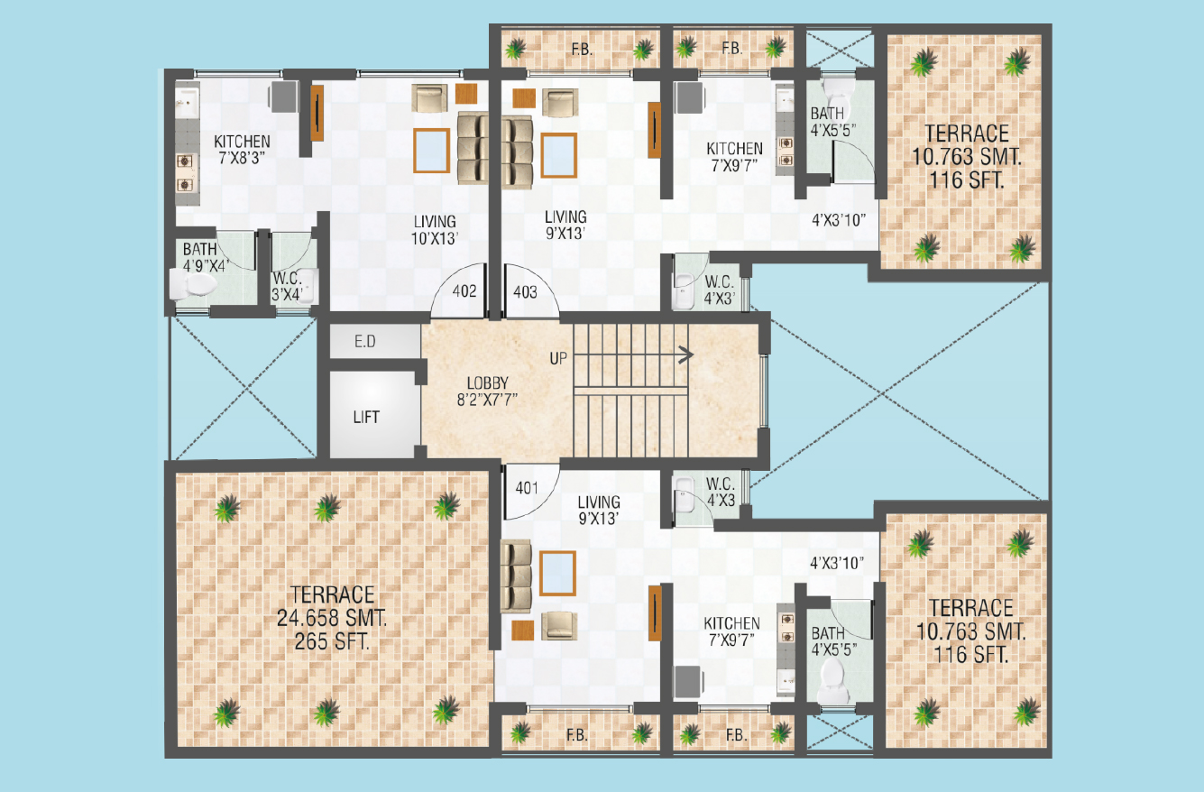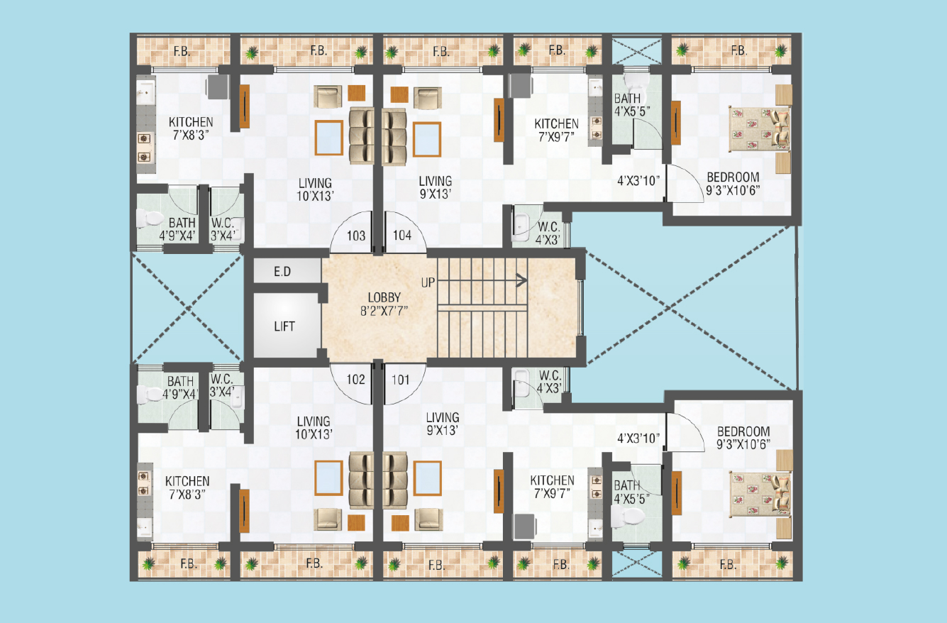 • Concealed wiring with ample Electrical and TV points with modular switches